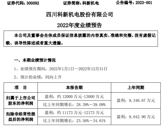 挖贝网1月16日,科新机电(300092)(300092)近日发布2022年年度业绩预告,报告期内归属于上市公司股东的净利润约12000万元-13000万元,比上年同期增长28.39%-39.09%。