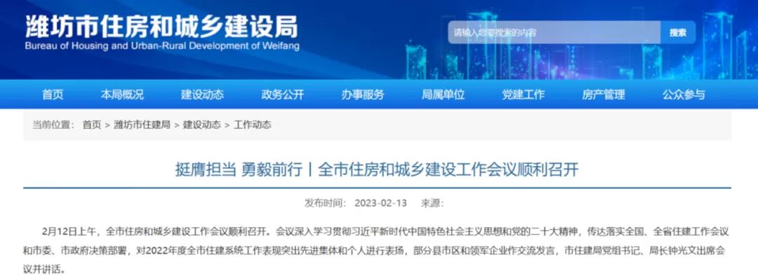 2月13日,潍坊市住建局发布了召开全市住房和城乡建设工作会议的内容。